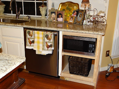 Ok . It's been a while but my kitchen is still a work in progress. Here I have relocated the microwave to under the counter and next to my table. Under the microwave will be a larger basket that will be used for something not sure what yet I hope to have this finished soon. We ran into some other issues like a leak that ruined my flooring so I will have to have it all replaced.